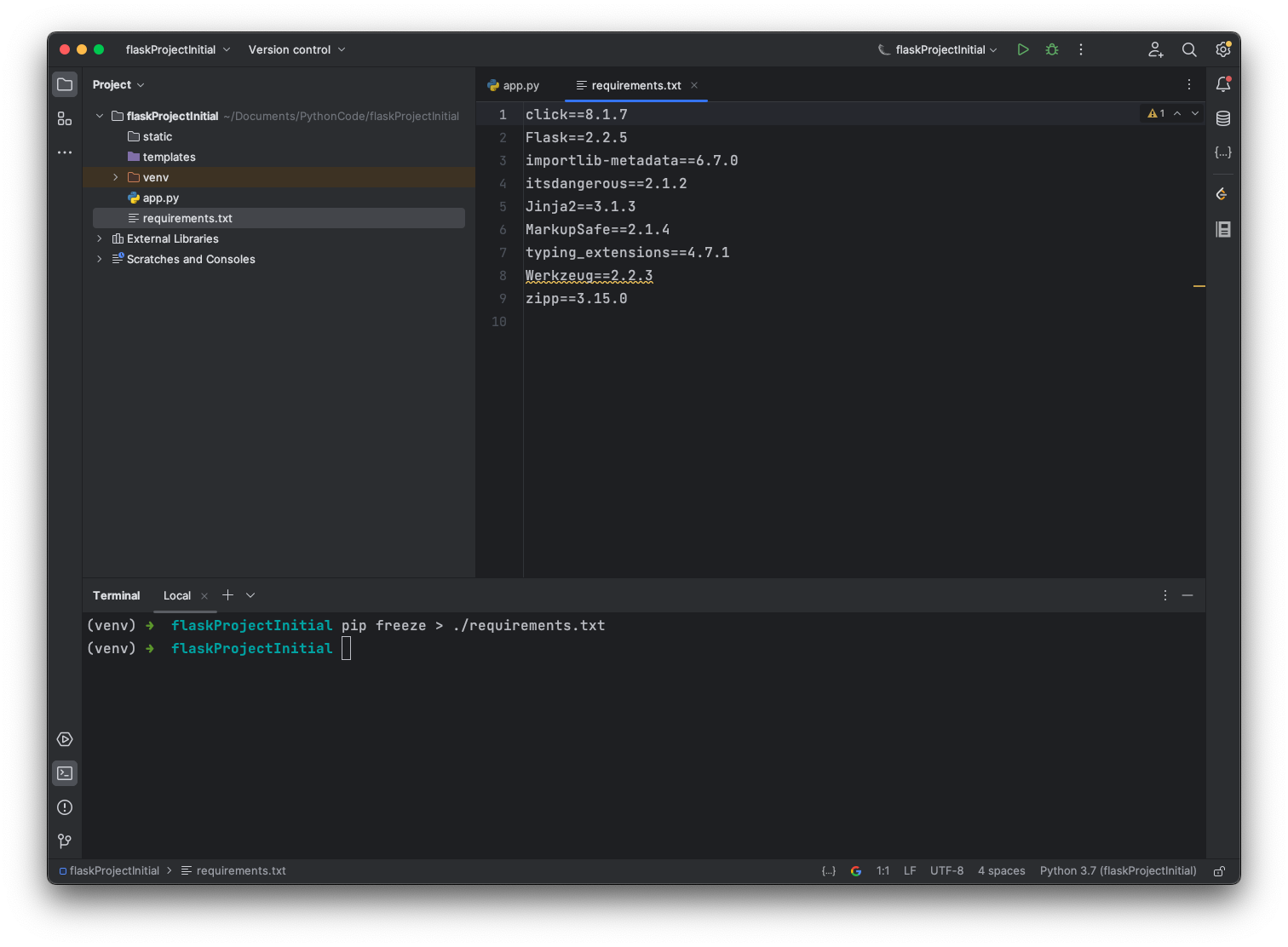 requirements 文件 由于集成开发环境帮我们已经安装好了 Flask 包,所以可以使用pip freeze > ./requirements.txt命令,直接生成一个 requirements.txt 文件
