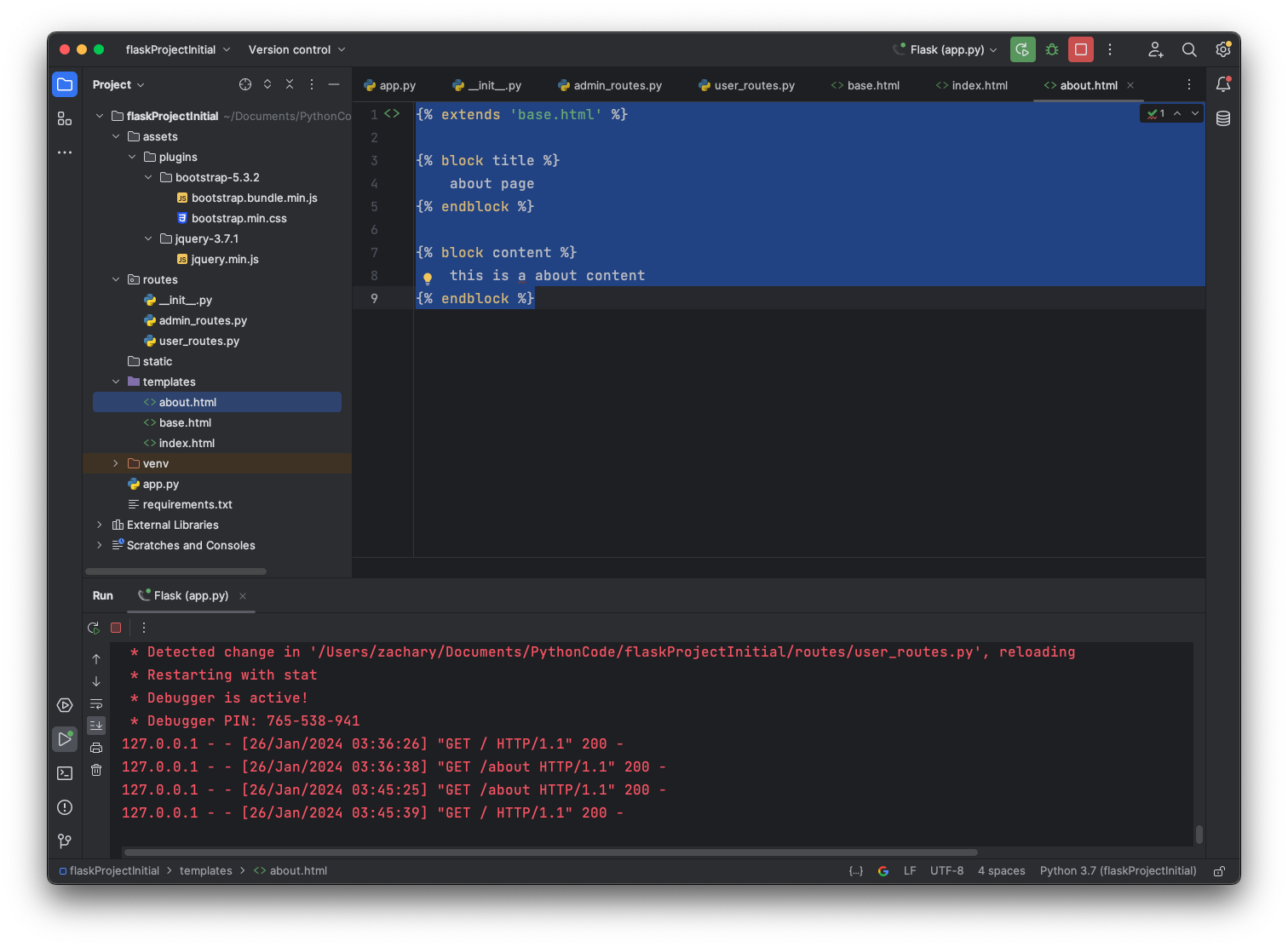 1 2 3 4 5 6 7 8 9 10 11 12 13 14 15 16 17 18 19 20 from flask import render_templatefrom routes import app@app.route('/' ) @app.route('/index' ) def home_page (): return render_template('index.html' ) @app.route('/about' ) def about_page (): return render_template('about.html' ) @app.route('/login' ) def login_page (): return 'Login Page!'