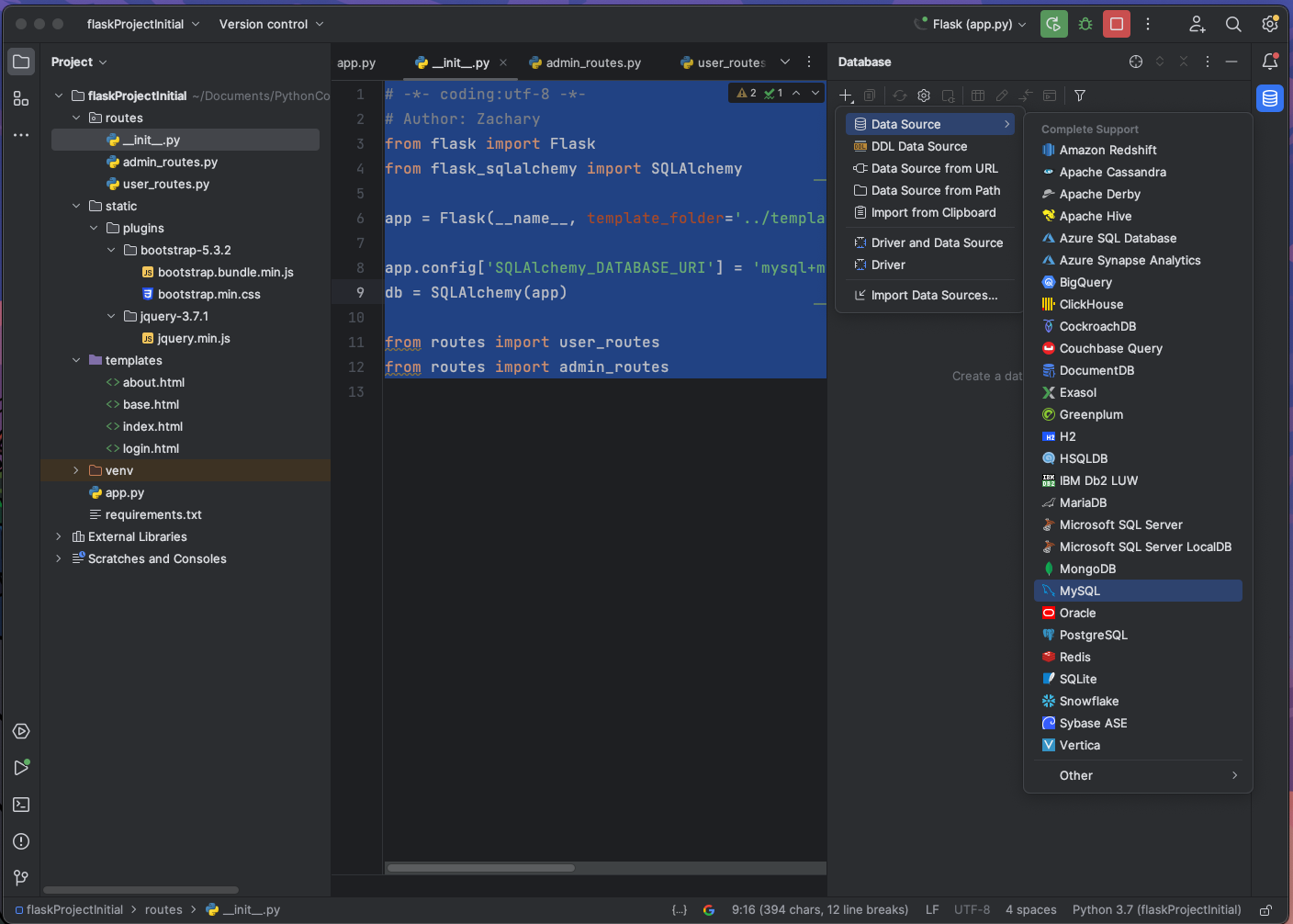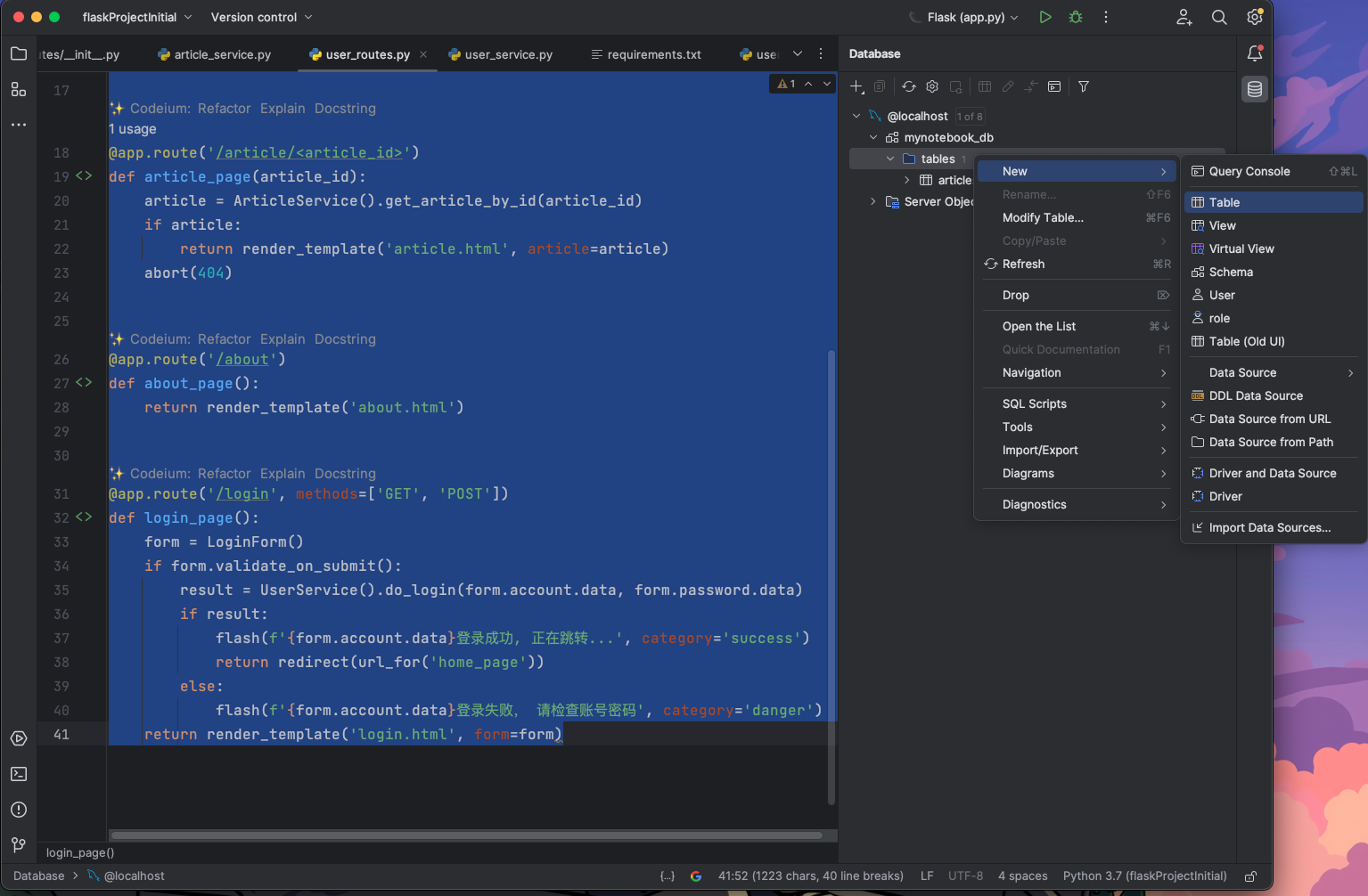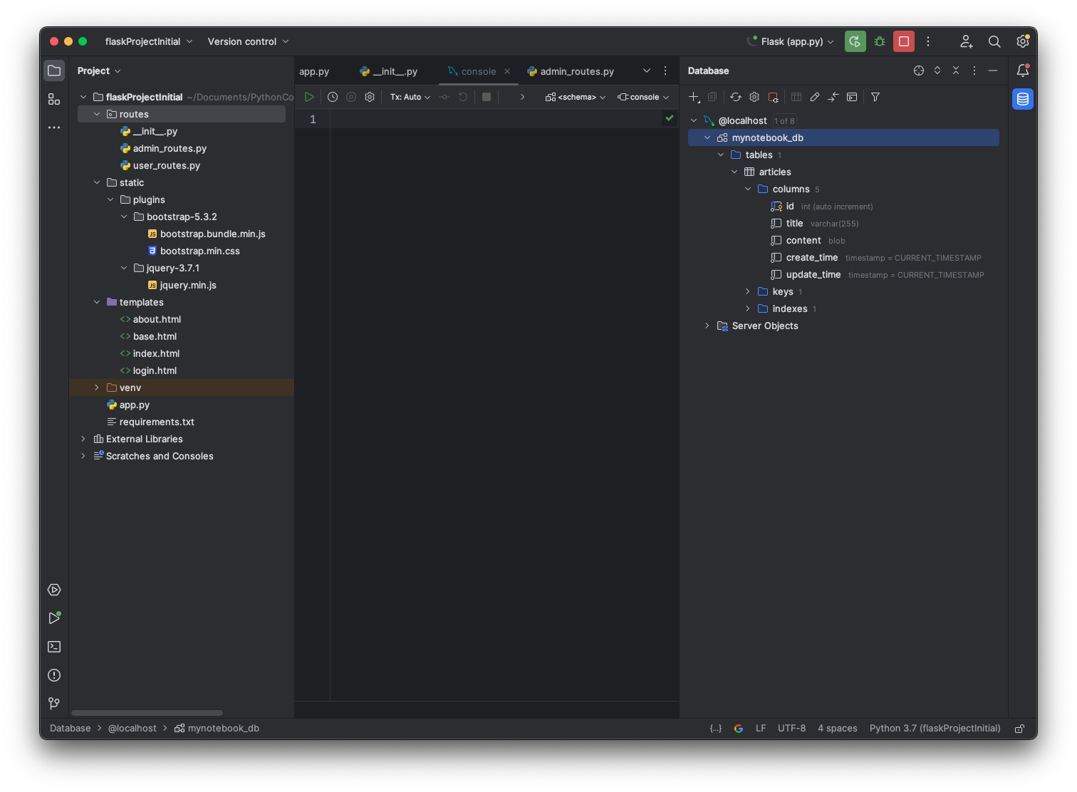 1 2 3 4 5 6 7 8 9 10 11 12 13 from flask import Flaskfrom flask_sqlalchemy import SQLAlchemyapp = Flask(__name__, template_folder='../templates' , static_folder='../static' , static_url_path='/static' ) app.config['SQLALCHEMY_DATABASE_URI' ] = 'mysql+mysqldb://root:980226@localhost/mynotebook_db' db = SQLAlchemy(app) from routes import user_routesfrom routes import admin_routes