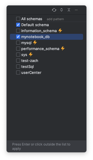 1 2 3 4 5 6 7 8 9 10 11 12 13 14 15 16 17 mysql> create database mynotebook_db; Query OK, 1 row affected (0.01 sec) mysql> show databases; +--------------------+ | Database | +--------------------+ | information_schema | | mynotebook_db | | mysql | | performance_schema | | sys | | test-zach | | testSql | | userCenter | +--------------------+ 8 rows in set (0.00 sec)