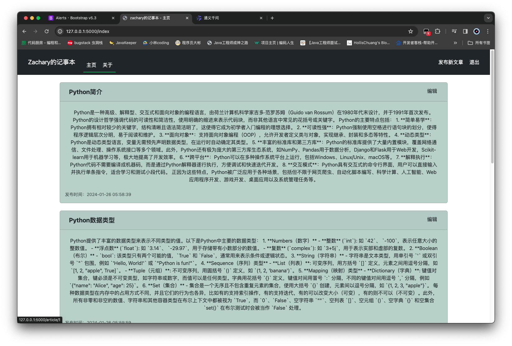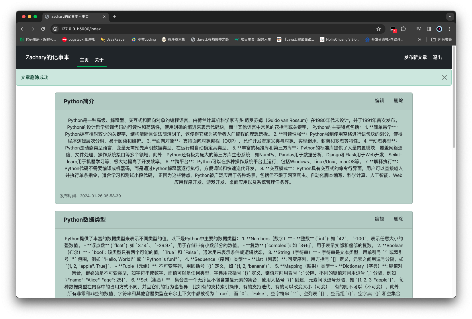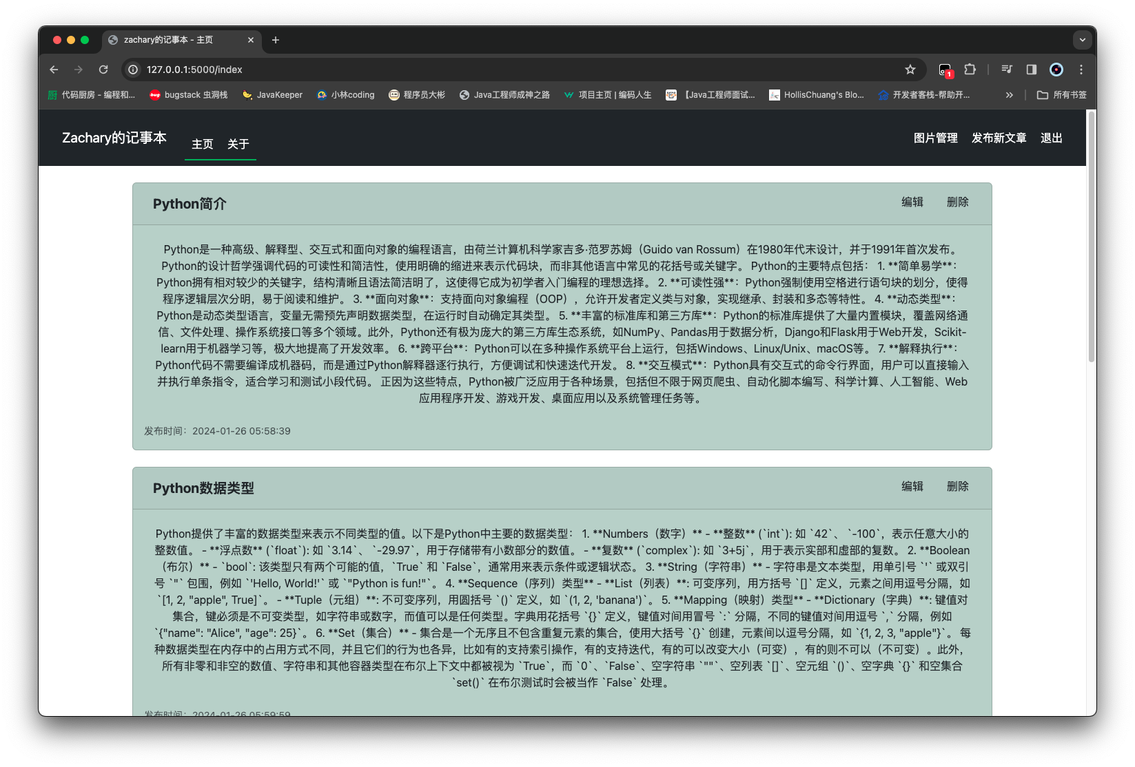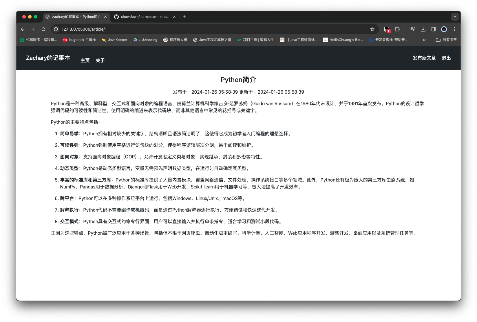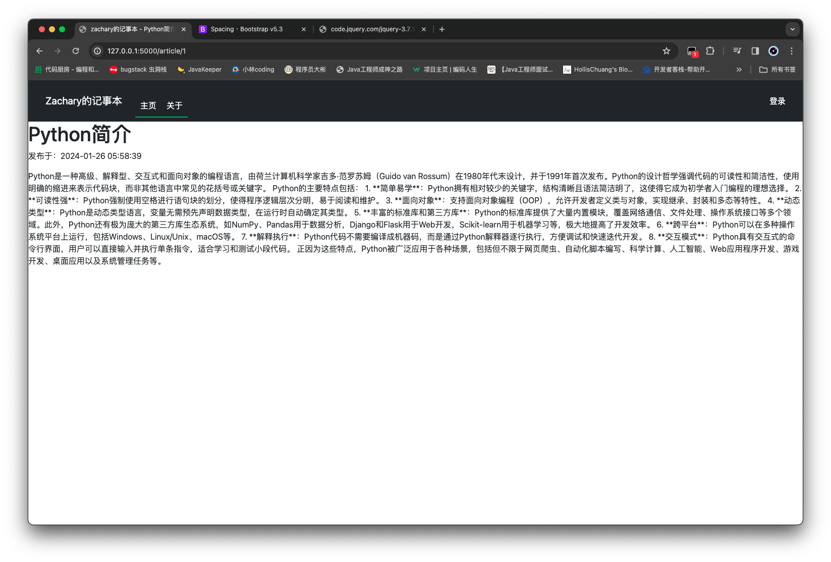 1 2 3 4 5 6 {% extends 'base.html' %} {% block title %} zachary的记事本 - {{ article.title }} {% endblock %} {% block content %} <h1 > {{ article.title }}</h1 > <p > 发布于:{{ article.create_time }}</p > <p > {{ article.content }}</p > {% endblock %}
