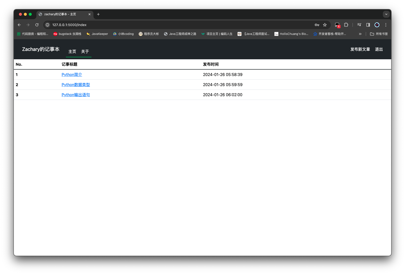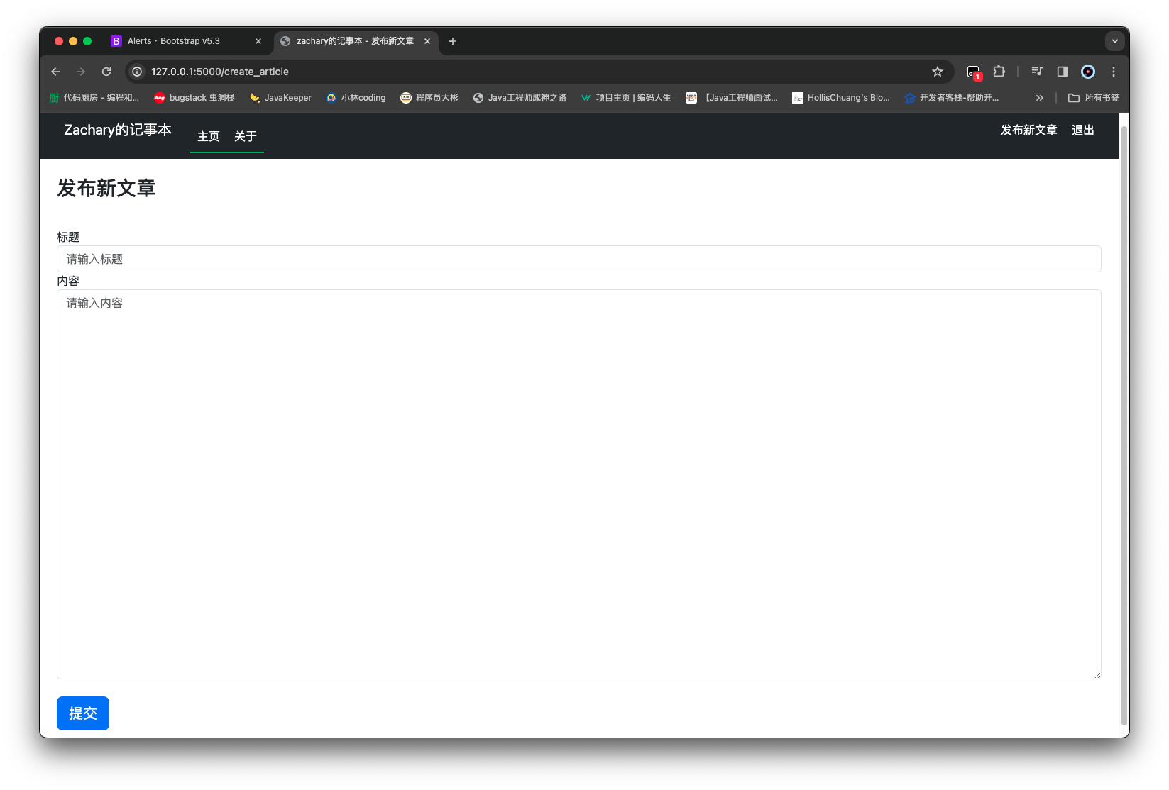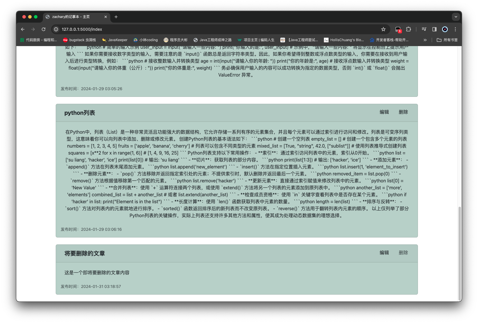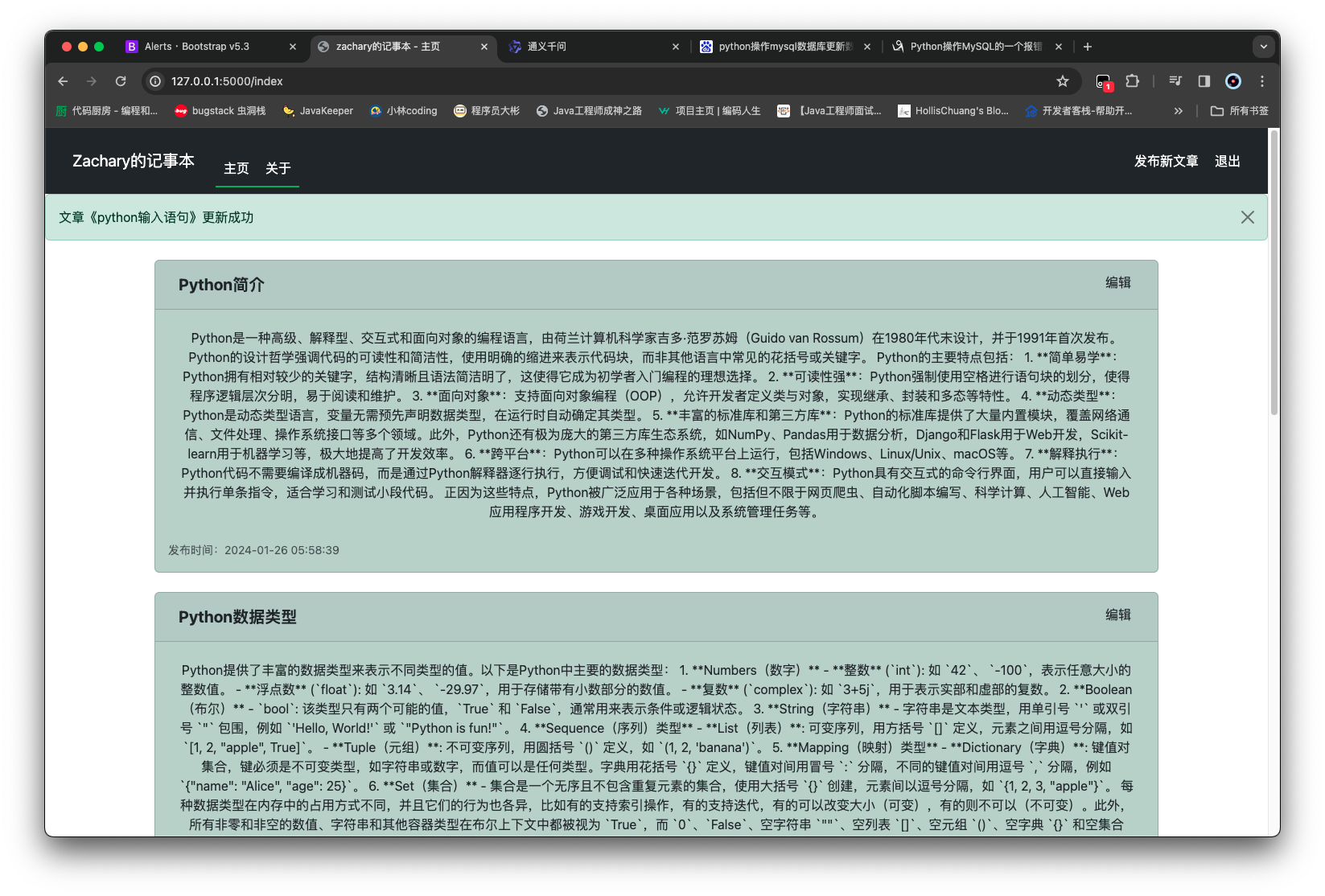 1 2 3 4 5 6 {% extends 'base.html' %} {% block title %} zachary的记事本 - {{ article.title }} {% endblock %} {% block content %} <h1 > {{ article.title }}</h1 > <p > 发布于:{{ article.create_time }}</p > <p > {{ article.content }}</p > {% endblock %}