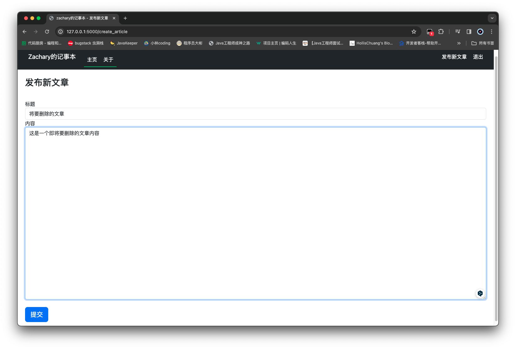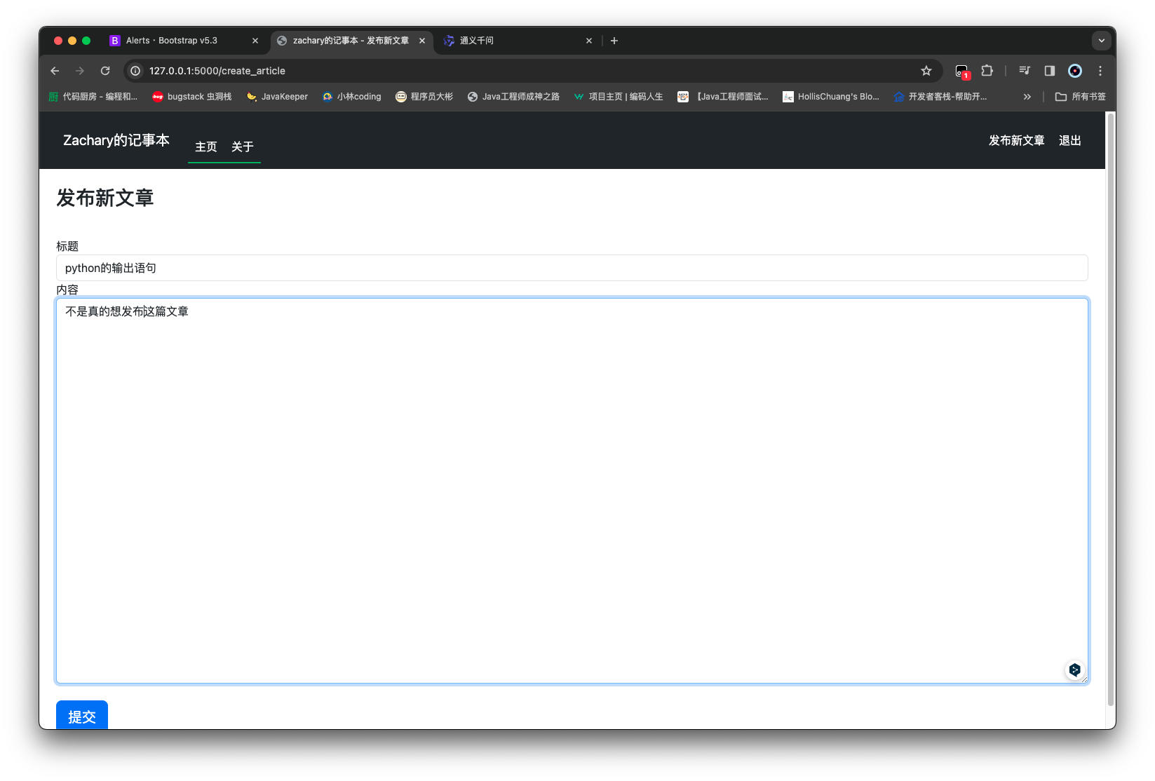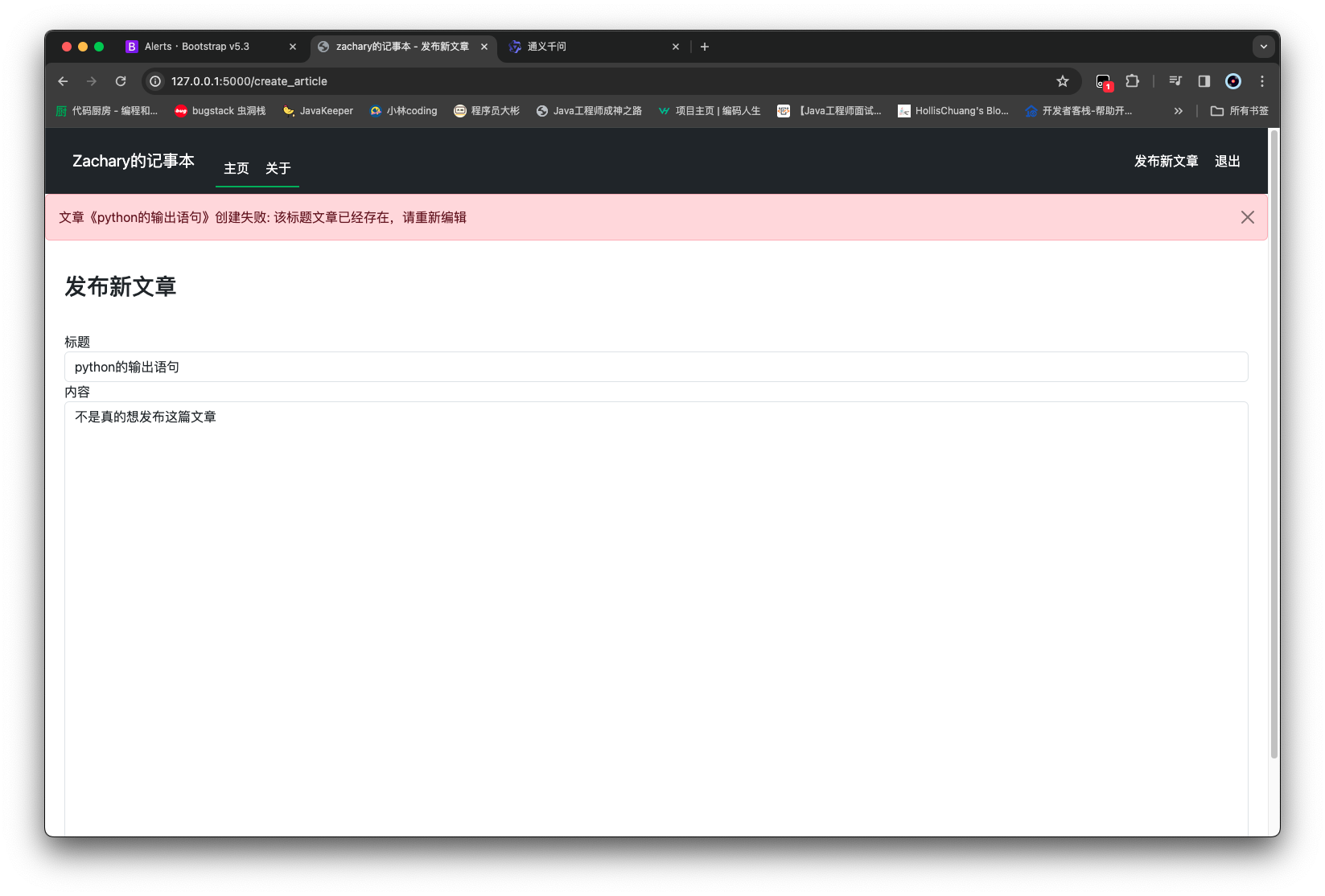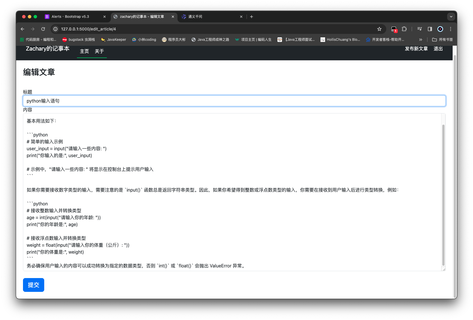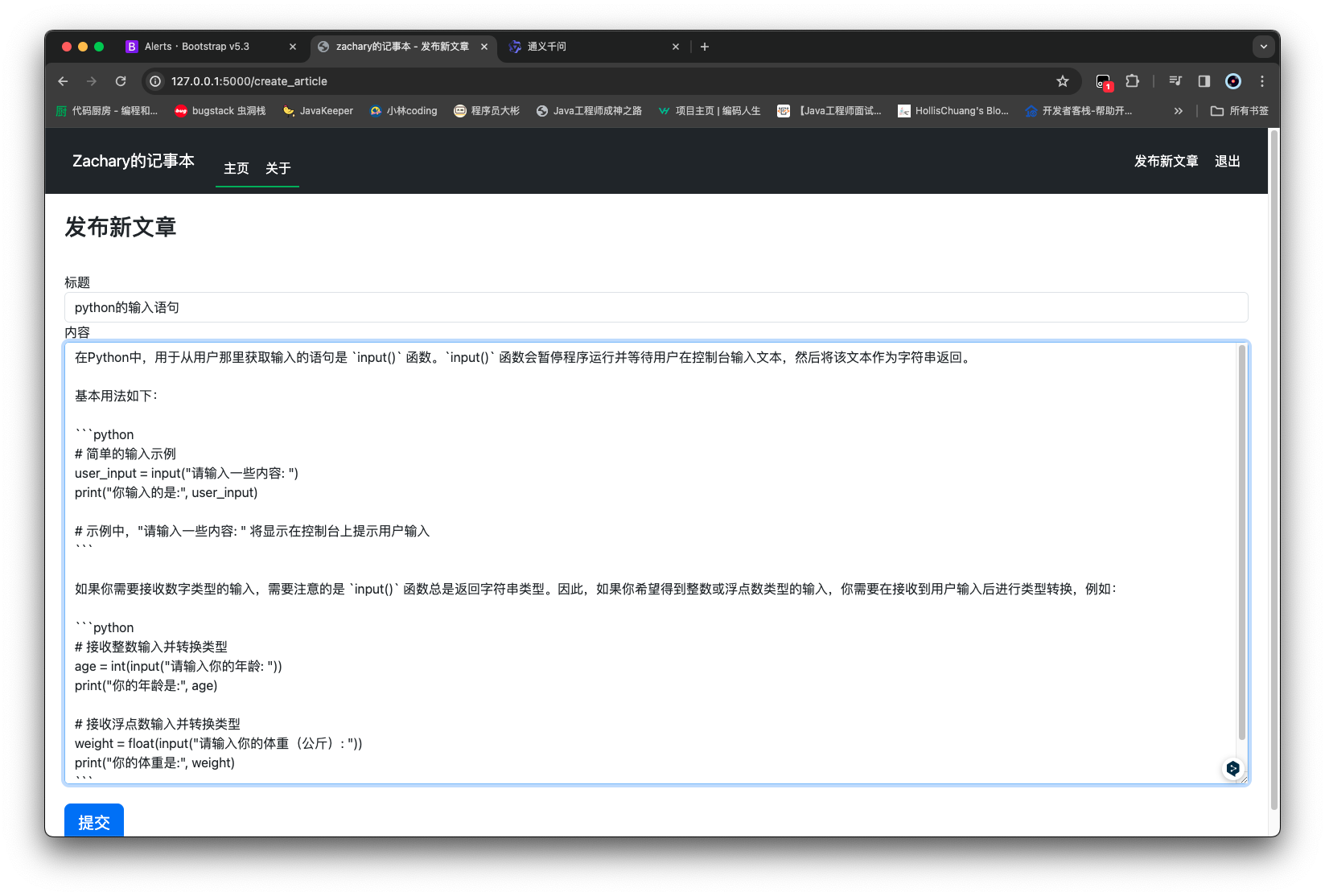 1 2 3 4 5 6 {% extends 'base.html' %} {% block title %} zachary的记事本 - {{ article.title }} {% endblock %} {% block content %} <h1 > {{ article.title }}</h1 > <p > 发布于:{{ article.create_time }}</p > <p > {{ article.content }}</p > {% endblock %}