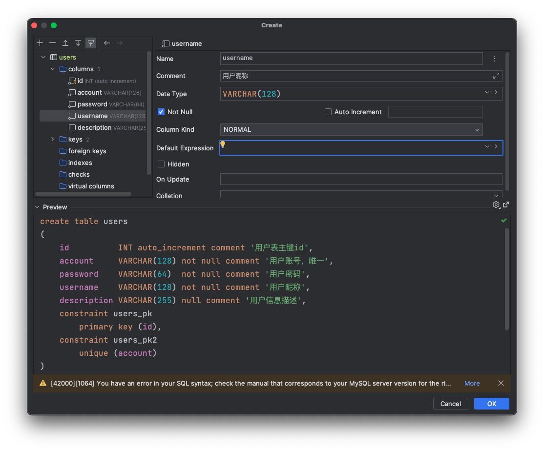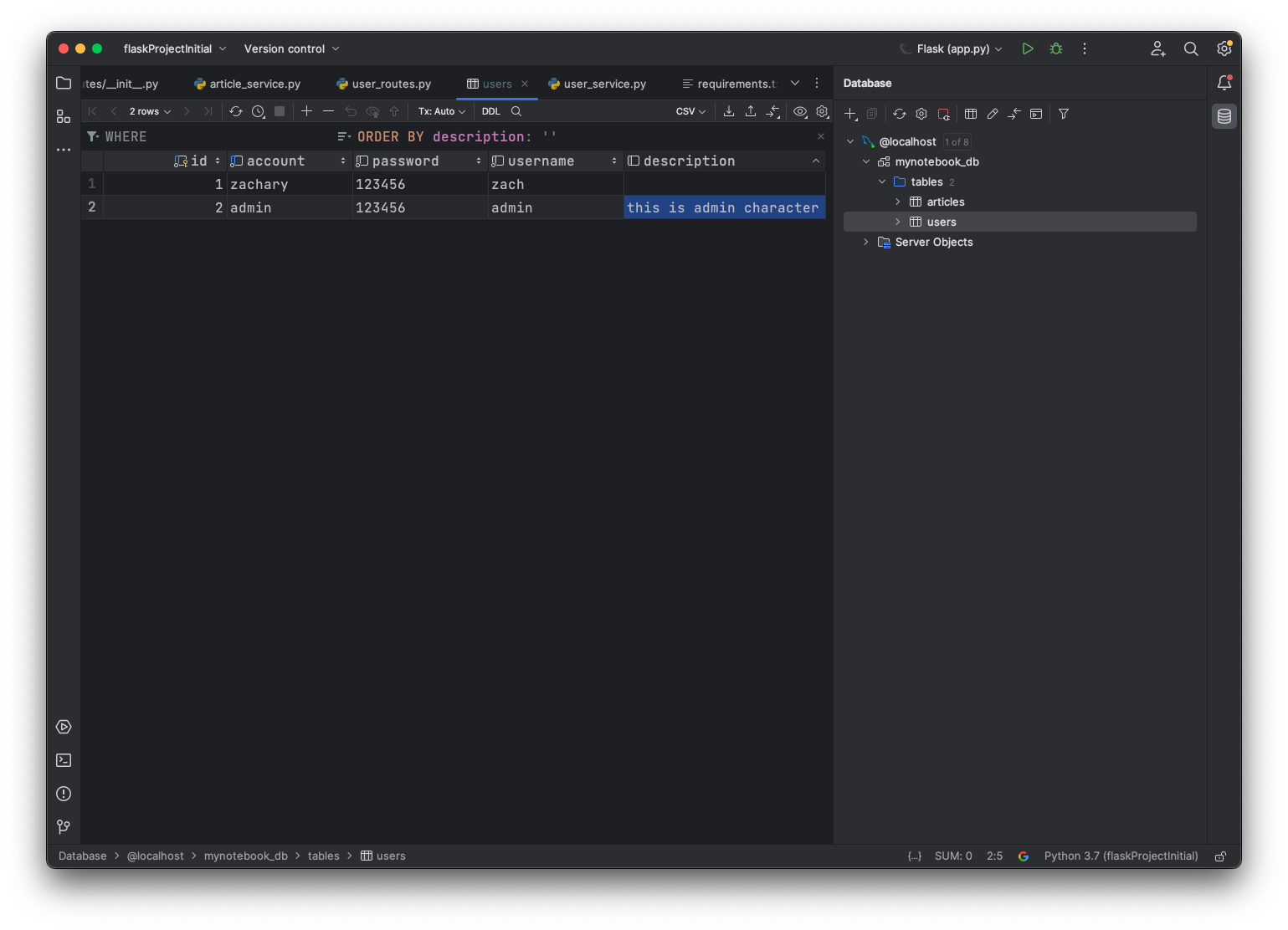 1 2 3 4 5 6 7 8 9 10 11 12 13 14 from sqlalchemy import Integer, Stringfrom sqlalchemy.orm import Mapped, mapped_columnfrom routes import dbclass User (db.Model): __tablename__ = 'users' id : Mapped[int ] = mapped_column(Integer, primary_key=True ) account: Mapped[str ] = mapped_column(String(128 ), unique=True , nullable=False ) password: Mapped[str ] = mapped_column(String(64 ), nullable=False ) username: Mapped[str ] = mapped_column(String(128 ), nullable=False ) description: Mapped[str ] = mapped_column(String(255 ), nullable=True )