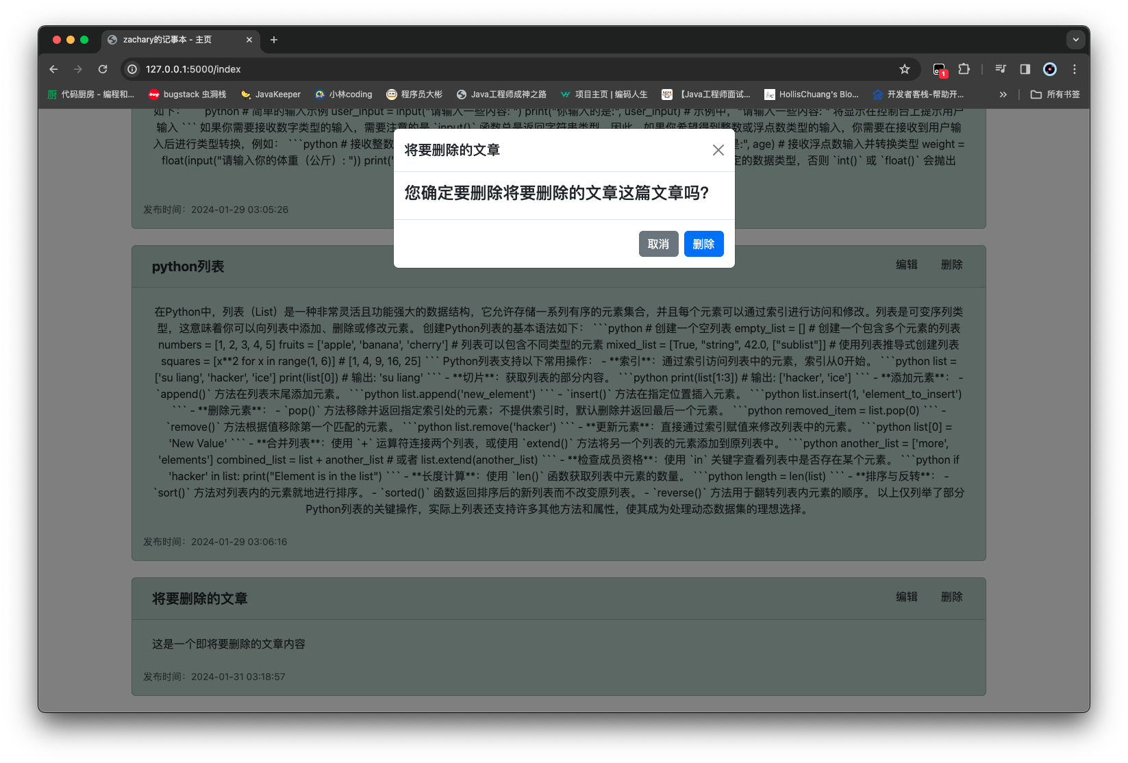 删除按钮的前端实现 1 2 3 4 5 6 7 8 9 10 11 12 13 14 15 16 17 18 19 20 21 22 23 24 25 26 27 28 29 30 31 32 33 34 35 36 37 38 39 40 41 42 43 44 45 46 47 48 49 50 51 52 53 54 55 56 57 58 {% extends 'base.html' %} {% block title %} zachary的记事本 - 主页 {% endblock %} {% block content %} <div class ="container-xl" > {% for article in articles %} <div class ="card m-4" style ="background-color: #bcd0c7" > <div class ="card-header" > <ul class ="nav" > <li class ="nav-item me-auto" > <a class ="btn fs-5 fw-bold" href ="{{ url_for('article_page', article_id=article.id) }}" > {{ article.title }}</a > </li > {% if current_user.is_authenticated %} <li class ="nav-item px-1" > <small class ="text-body-secondary" > <a class ="btn" href ="{{ url_for('edit_article_page', article_id=article.id) }}" > 编辑</a > </small > </li > <li class ="nav-item px-1" > <small class ="text-body-secondary" > <button class ="btn" data-bs-toggle ="modal" data-bs-target ="#Modal-DeleteConfirm-{{ article.id }}" > 删除 </button > </small > </li > {% endif %} </ul > </div > <div class ="card-body" > <p class ="card-text" > <a class ="btn fs-6" href ="{{ url_for('article_page', article_id=article.id) }}" > {{ article.content }}</a > </p > <ul class ="nav" > <li class ="nav-item me-auto" > <small class ="text-body-secondary" > 发布时间:{{ article.create_time }}</small > </li > </ul > </div > </div > {% endfor %} </div > {% endblock %}