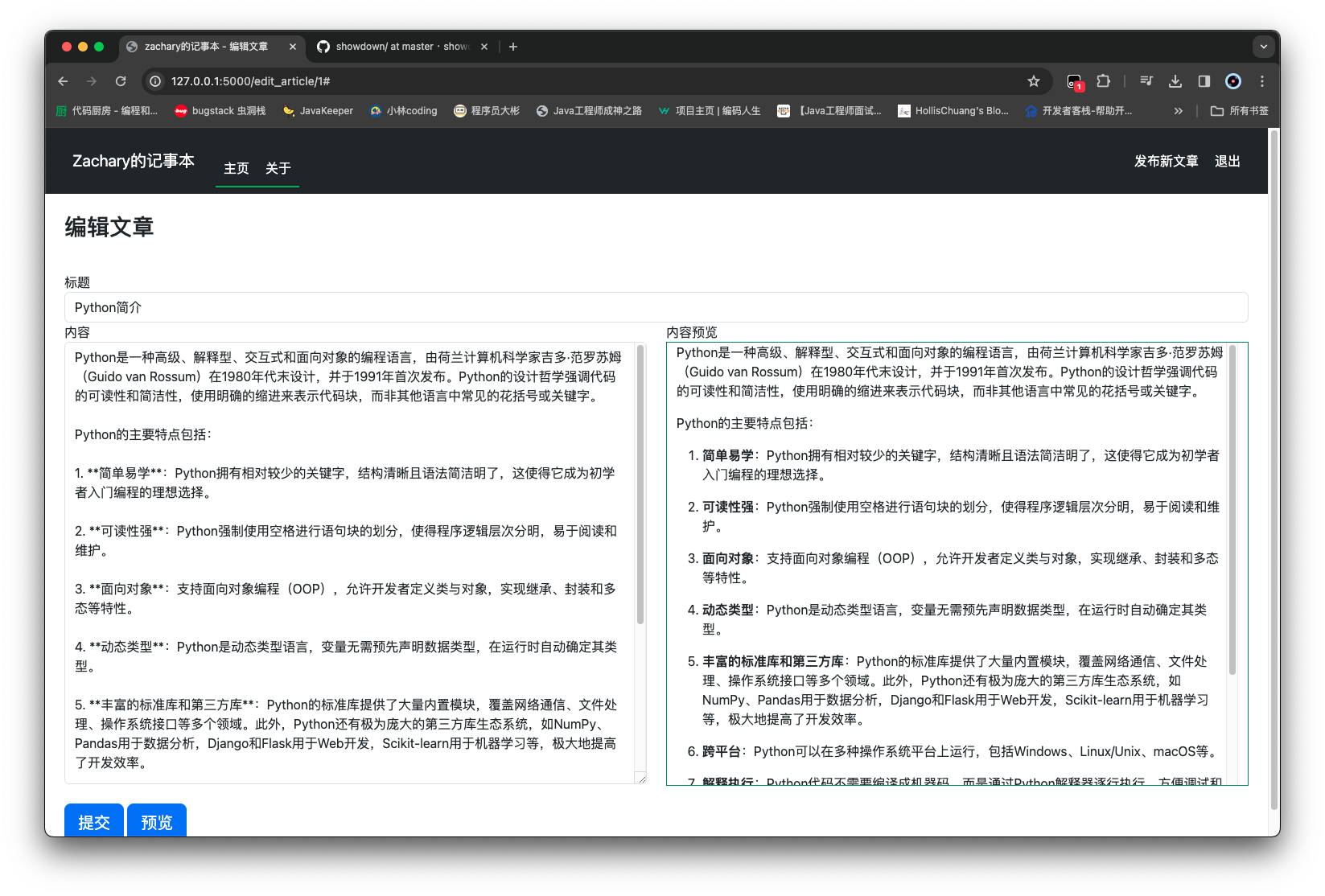 1 2 3 4 5 6 7 $(function ( ) { $("#article_previewer_btn" ).click (function ( ) { var converter = new showdown.Converter (); var article_html = converter.makeHtml ($("#content" ).val ()); $("#article_previewer" ).html (article_html); }); });