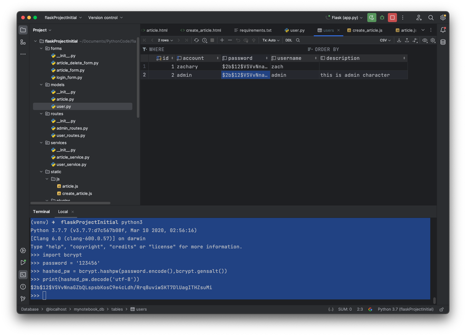 1 2 3 4 5 6 7 8 9 10 11 12 13 14 15 16 17 18 19 20 21 22 23 from sqlalchemy import inspectfrom routes import app, dbimport bcryptdef init_db (): with app.app_context(): inspector = inspect(db.engine) if not inspector.has_table('users' ): from models.user import User from models.article import Article db.create_all() hashed_password = bcrypt.hashpw("123456" .encode(), bcrypt.gensalt()) user = User(account="zachary" , password=hashed_password.decode(), username="zachary" ) db.session.add(user) db.session.commit() if __name__ == '__main__' : init_db() app.run(host='0.0.0.0' , debug=True , port=8080 )