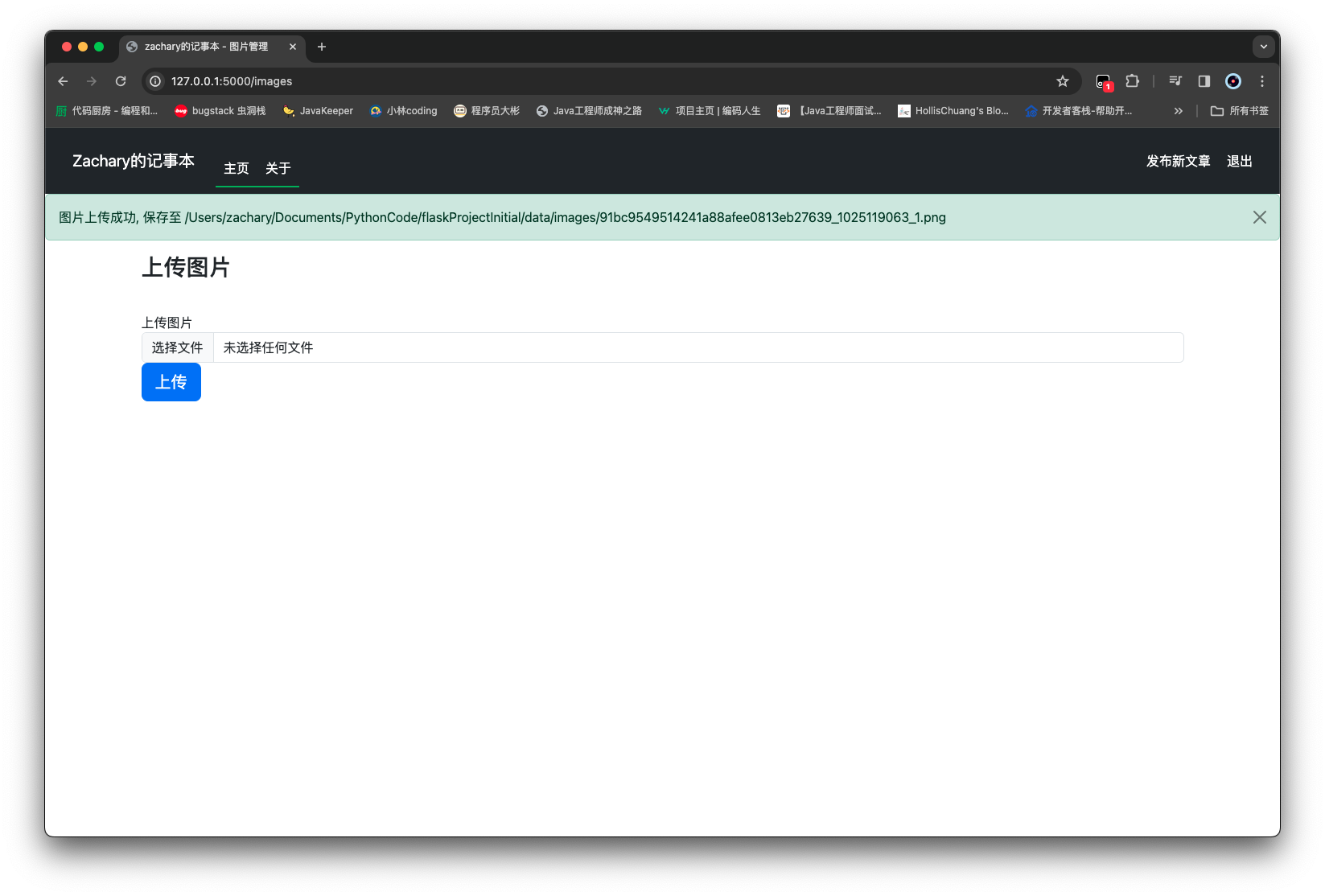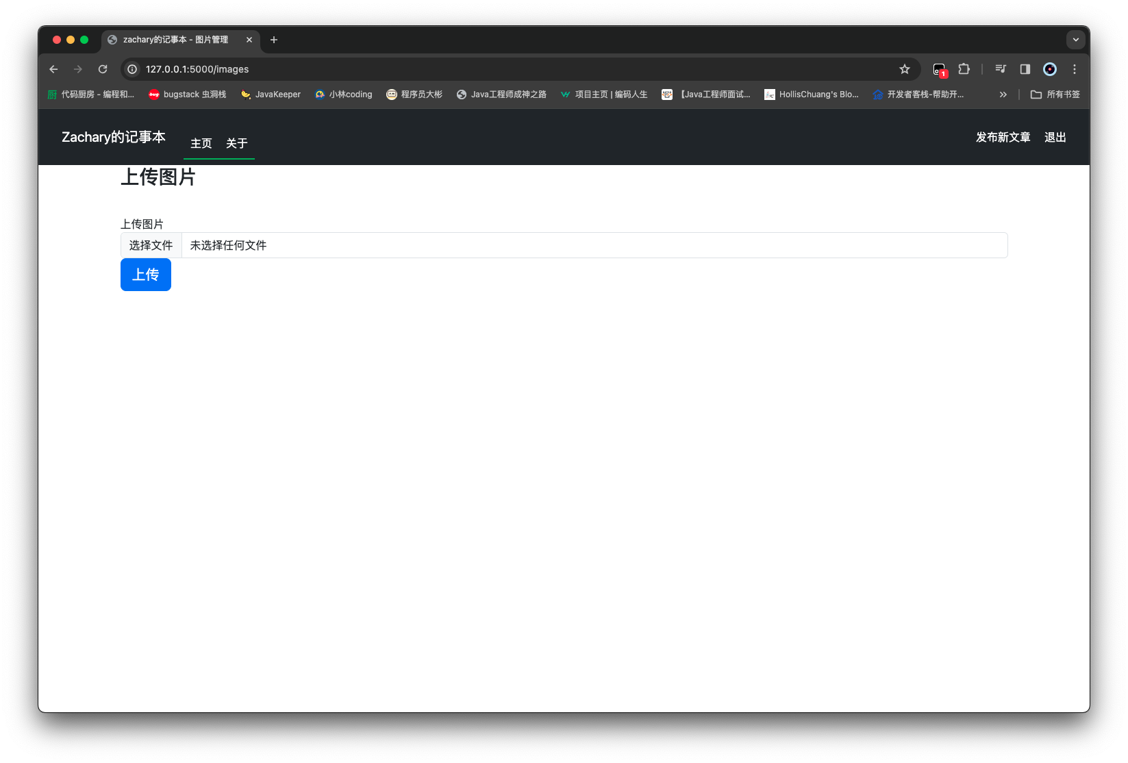 1 2 3 4 5 6 7 8 9 10 11 12 {% extends 'base.html' %} {% block title %} zachary的记事本 - 图片管理 {% endblock %} {% block content %} <div class ="container-xl" > <form method ="POST" class ="form-signin" enctype ="multipart/form-data" > {{ form.hidden_tag() }} <h1 class ="h3 mb-3 font-weight-normal" > 上传图片</h1 > <br /> {{ form.image.label }} {{ form.image(class="form-control") }} {{ form.submit(class="btn btn-lg btn-primary btn-block") }} </form > </div > {% endblock %}