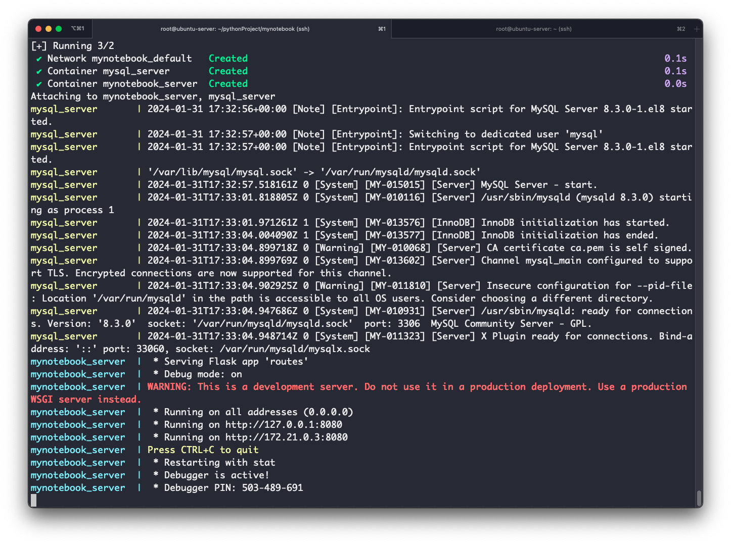 启动 1 2 3 4 5 6 7 8 9 10 11 12 13 14 15 16 17 18 19 20 21 22 23 24 25 26 27 28 29 root@ubuntu-server:~/pythonProject/mynotebook# docker compose up [+] Running 3/2 ✔ Network mynotebook_default Created 0.1s ✔ Container mysql_server Created 0.1s ✔ Container mynotebook_server Created 0.0s Attaching to mynotebook_server, mysql_server mysql_server | 2024-01-31 17:32:56+00:00 [Note] [Entrypoint]: Entrypoint script for MySQL Server 8.3.0-1.el8 started. mysql_server | 2024-01-31 17:32:57+00:00 [Note] [Entrypoint]: Switching to dedicated user 'mysql' mysql_server | 2024-01-31 17:32:57+00:00 [Note] [Entrypoint]: Entrypoint script for MySQL Server 8.3.0-1.el8 started. mysql_server | '/var/lib/mysql/mysql.sock' -> '/var/run/mysqld/mysqld.sock' mysql_server | 2024-01-31T17:32:57.518161Z 0 [System] [MY-015015] [Server] MySQL Server - start. mysql_server | 2024-01-31T17:33:01.818805Z 0 [System] [MY-010116] [Server] /usr/sbin/mysqld (mysqld 8.3.0) starting as process 1 mysql_server | 2024-01-31T17:33:01.971261Z 1 [System] [MY-013576] [InnoDB] InnoDB initialization has started. mysql_server | 2024-01-31T17:33:04.004090Z 1 [System] [MY-013577] [InnoDB] InnoDB initialization has ended. mysql_server | 2024-01-31T17:33:04.899718Z 0 [Warning] [MY-010068] [Server] CA certificate ca.pem is self signed. mysql_server | 2024-01-31T17:33:04.899769Z 0 [System] [MY-013602] [Server] Channel mysql_main configured to support TLS. Encrypted connections are now supported for this channel. mysql_server | 2024-01-31T17:33:04.902925Z 0 [Warning] [MY-011810] [Server] Insecure configuration for --pid-file: Location '/var/run/mysqld' in the path is accessible to all OS users. Consider choosing a different directory. mysql_server | 2024-01-31T17:33:04.947686Z 0 [System] [MY-010931] [Server] /usr/sbin/mysqld: ready for connections. Version: '8.3.0' socket: '/var/run/mysqld/mysqld.sock' port: 3306 MySQL Community Server - GPL. mysql_server | 2024-01-31T17:33:04.948714Z 0 [System] [MY-011323] [Server] X Plugin ready for connections. Bind-address: '::' port: 33060, socket: /var/run/mysqld/mysqlx.sock mynotebook_server | * Serving Flask app 'routes' mynotebook_server | * Debug mode: on mynotebook_server | WARNING: This is a development server. Do not use it in a production deployment. Use a production WSGI server instead. mynotebook_server | * Running on all addresses (0.0.0.0) mynotebook_server | * Running on http://127.0.0.1:8080 mynotebook_server | * Running on http://172.21.0.3:8080 mynotebook_server | Press CTRL+C to quit mynotebook_server | * Restarting with stat mynotebook_server | * Debugger is active! mynotebook_server | * Debugger PIN: 503-489-69
