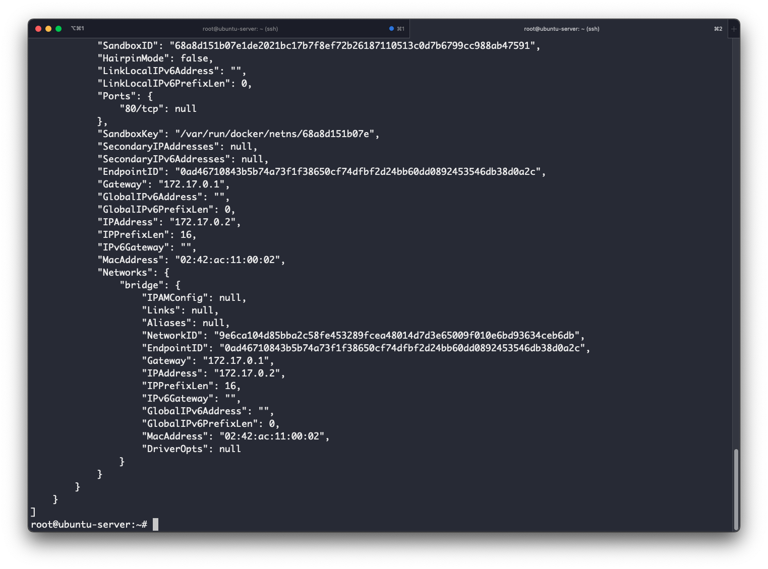 1 | root@ubuntu-server:~# docker inspect 8e1148f9c025 |