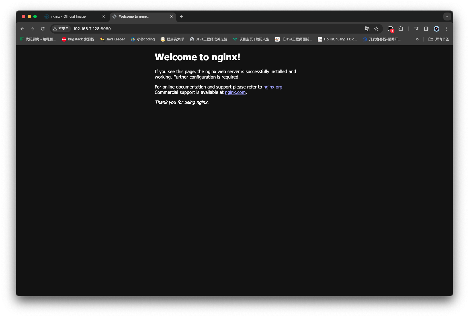 之后在浏览器通过访问主机 ip 地址+port 端口号 (192.168.7.128:8089),访问刚才启动的 nginx 服务