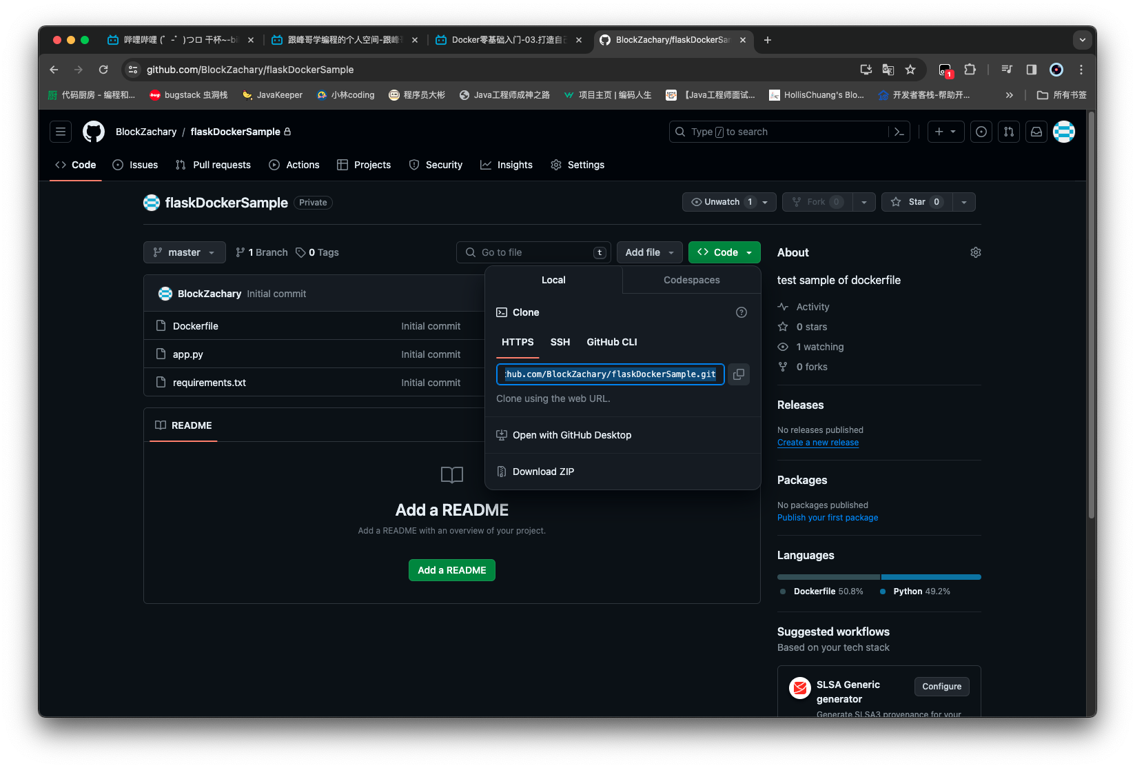 使用docker build . -t zacharyblock/myflasksample构建一下 image