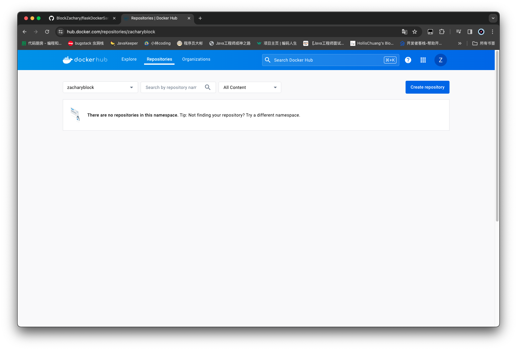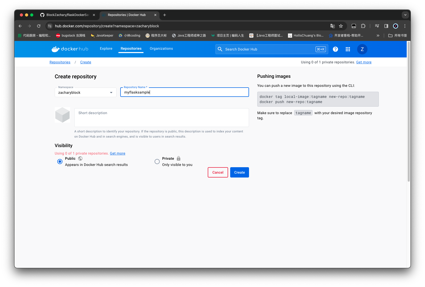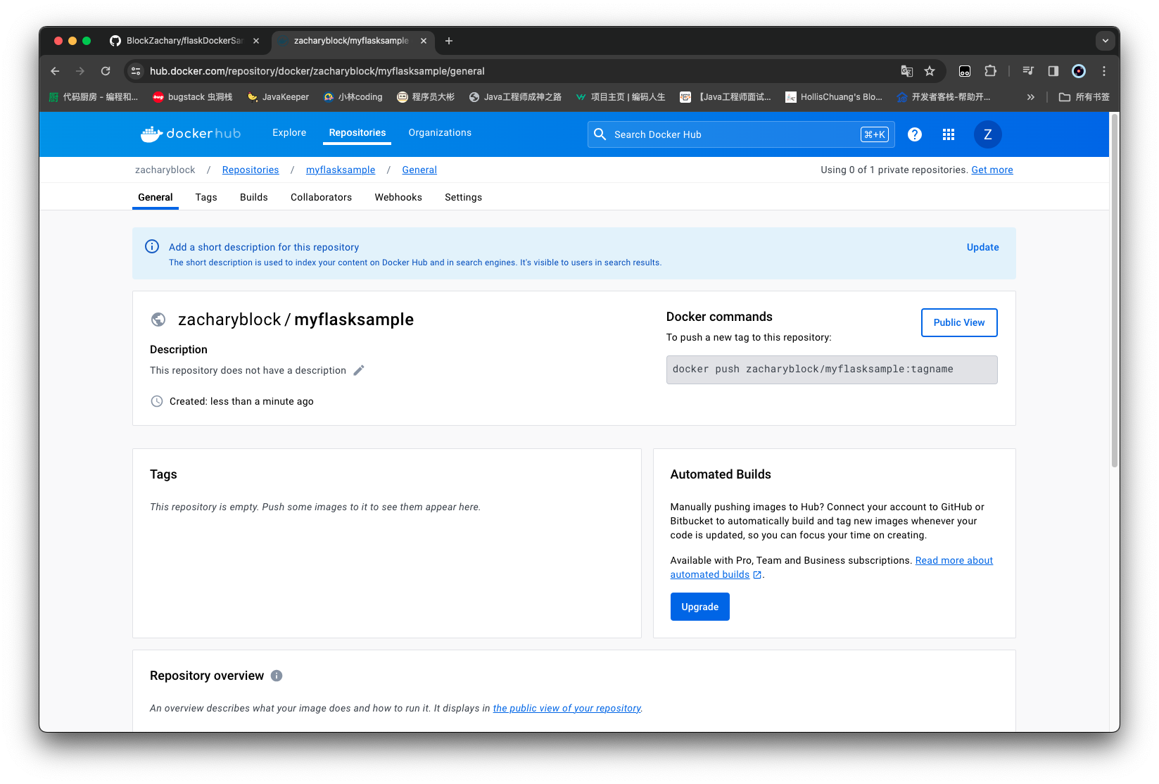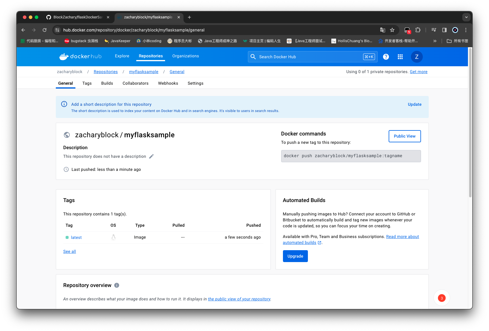 1 | root@ubuntu-server:~/pythonProject/flaskDockerSample# docker push zacharyblock/myflasksample |