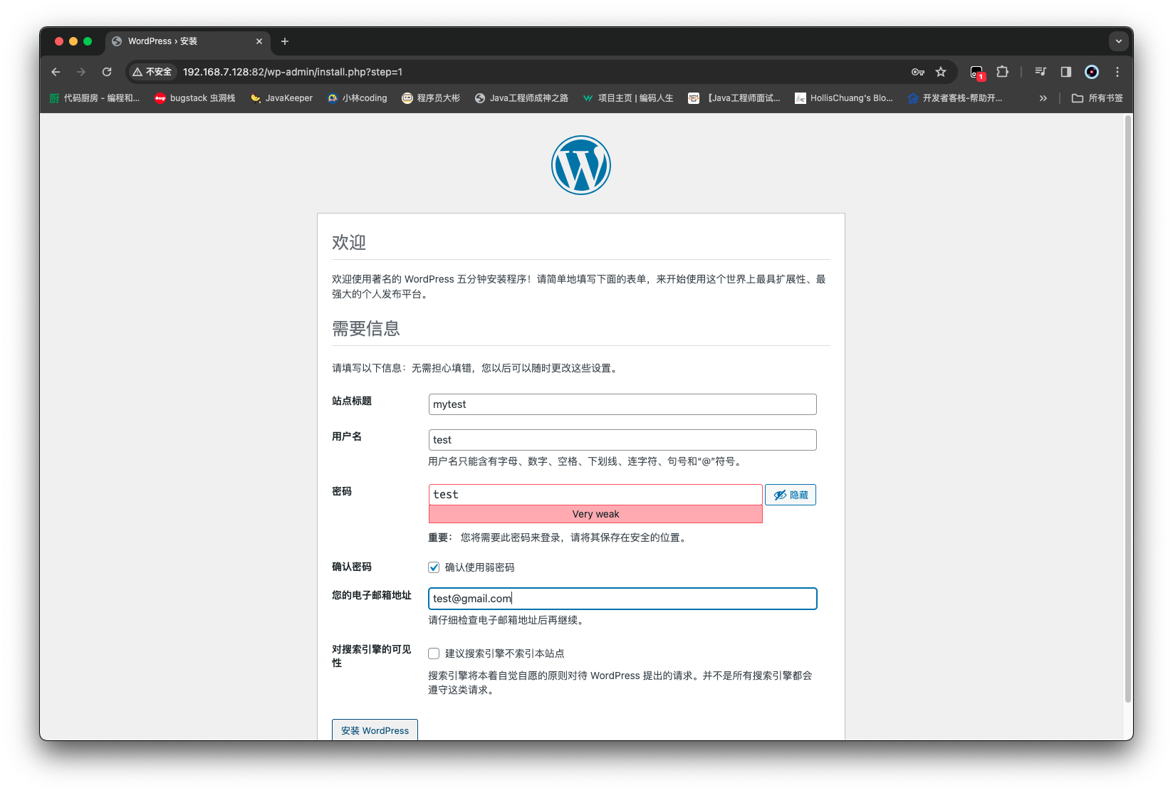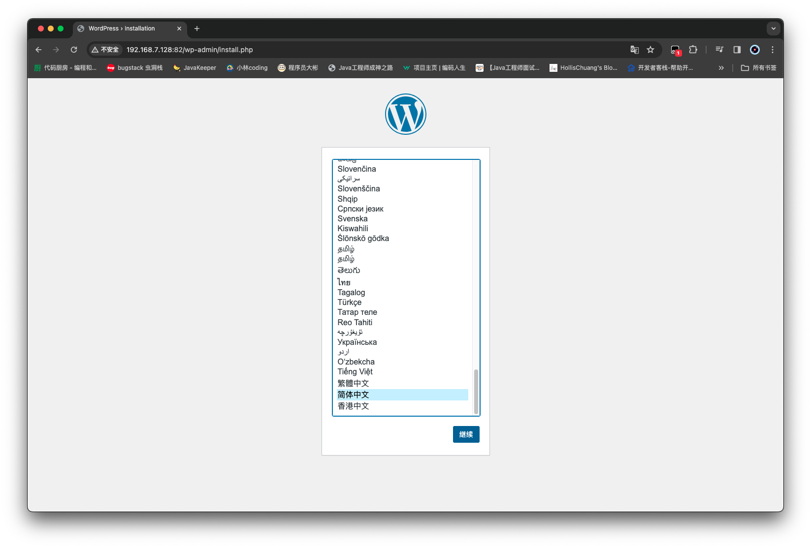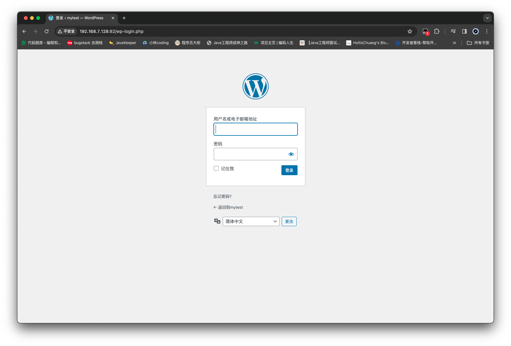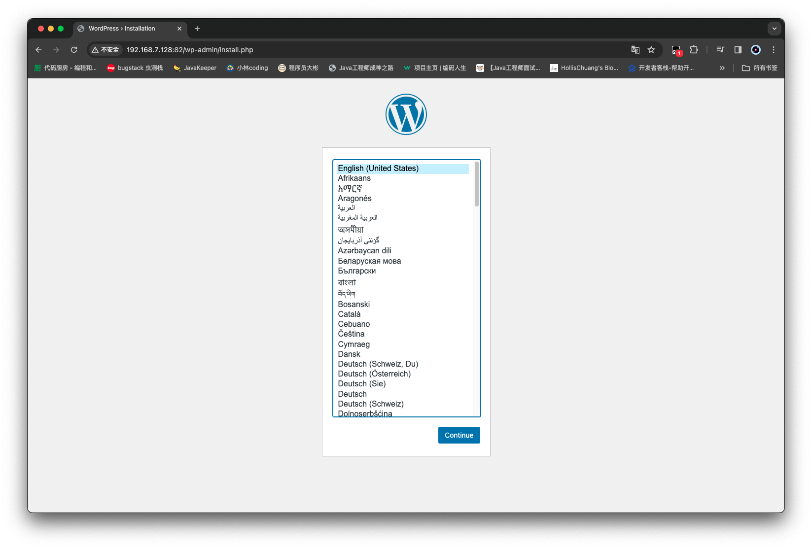 在浏览器输入主机 ip:82,可以进入 wordpress 页面